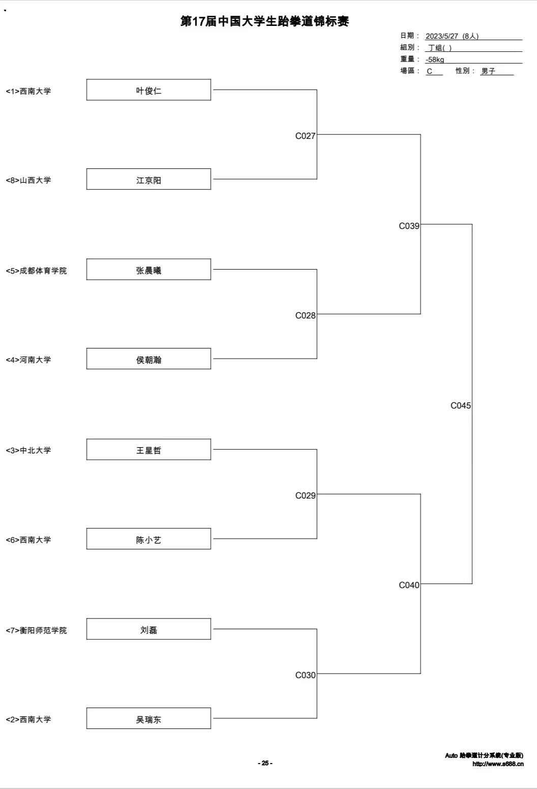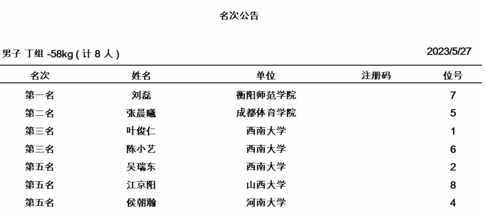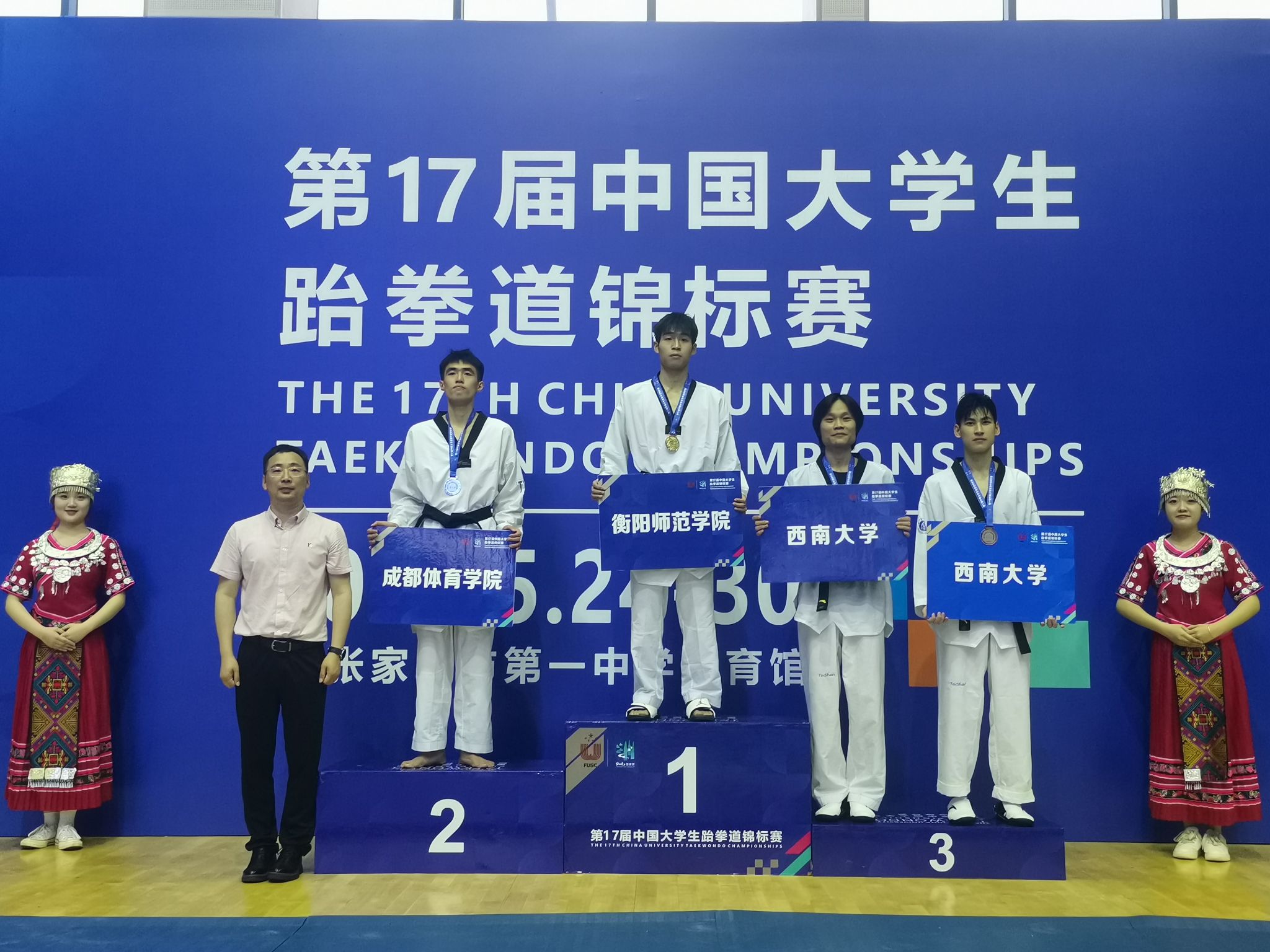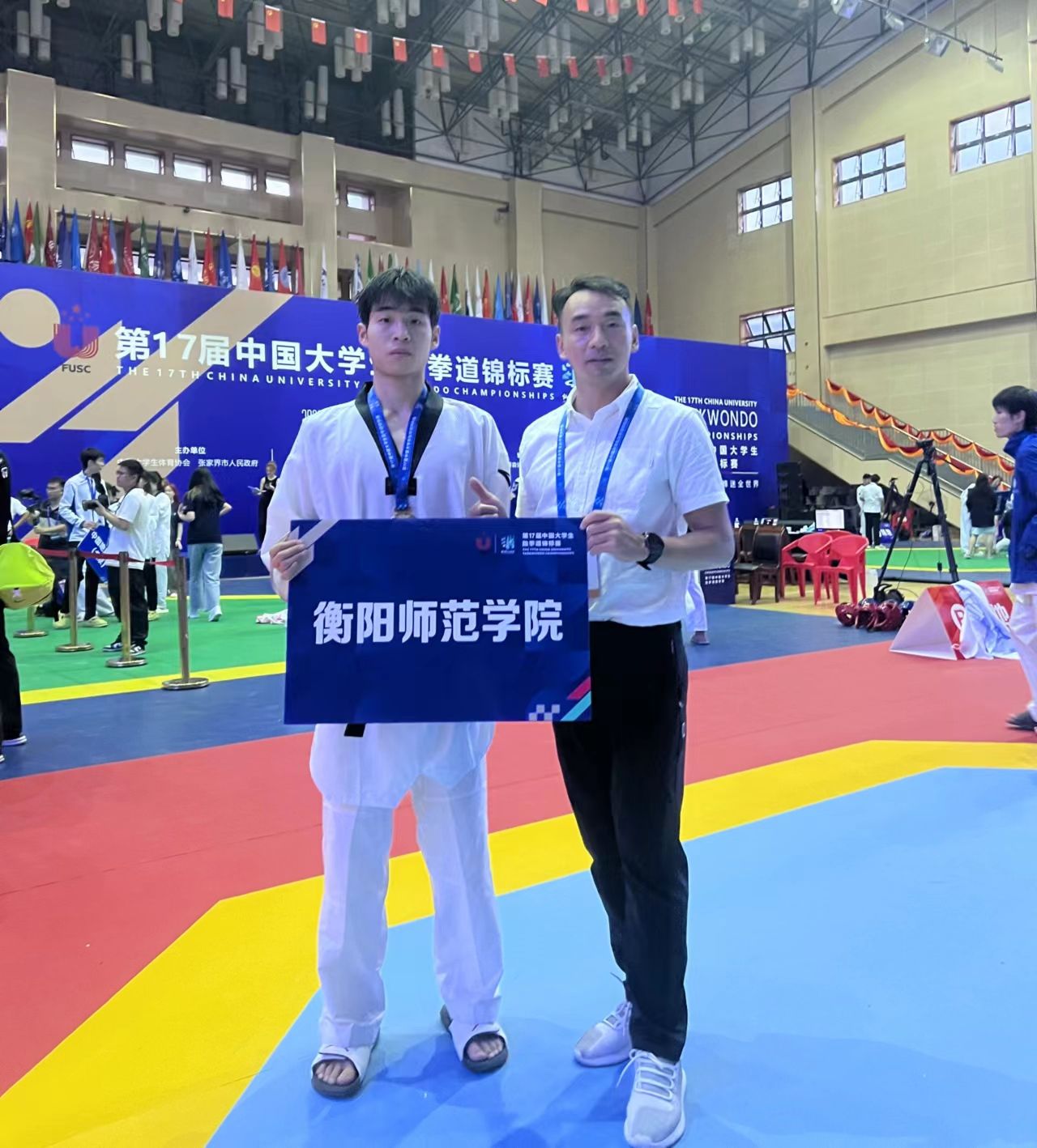 第17届中国大学生跆拳道锦标赛于5月26日在湖南省张家界市开幕,历时4天,汇聚了湖南大学、中国政法大学、中国科学技术大学、华南理工大学、新疆师范大学等185支高校队伍参赛。比赛成绩来之不易,刘磊同学入校三年以来刻苦训练,赛场上力克实力强劲的多名前全国冠军,艰难获胜,再一次充分展示了衡师学子坚韧的品质和积极向上的精神风貌。赛后采访中,他本人表示在今后的训练比赛中,将继续发扬优良传统,为学院争取更多的荣誉。
