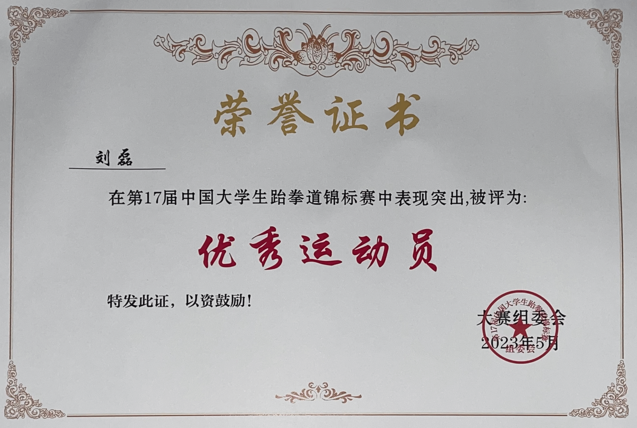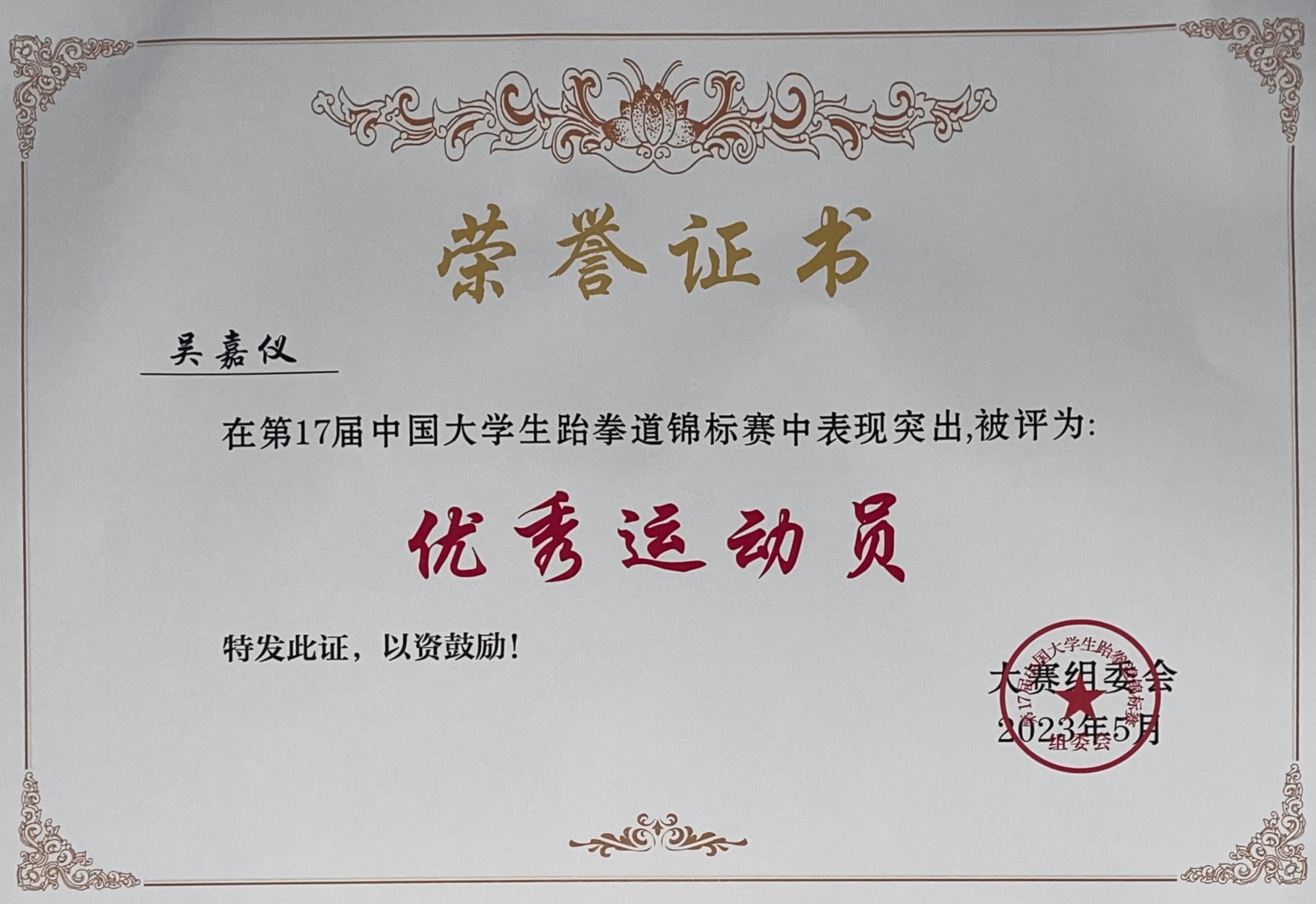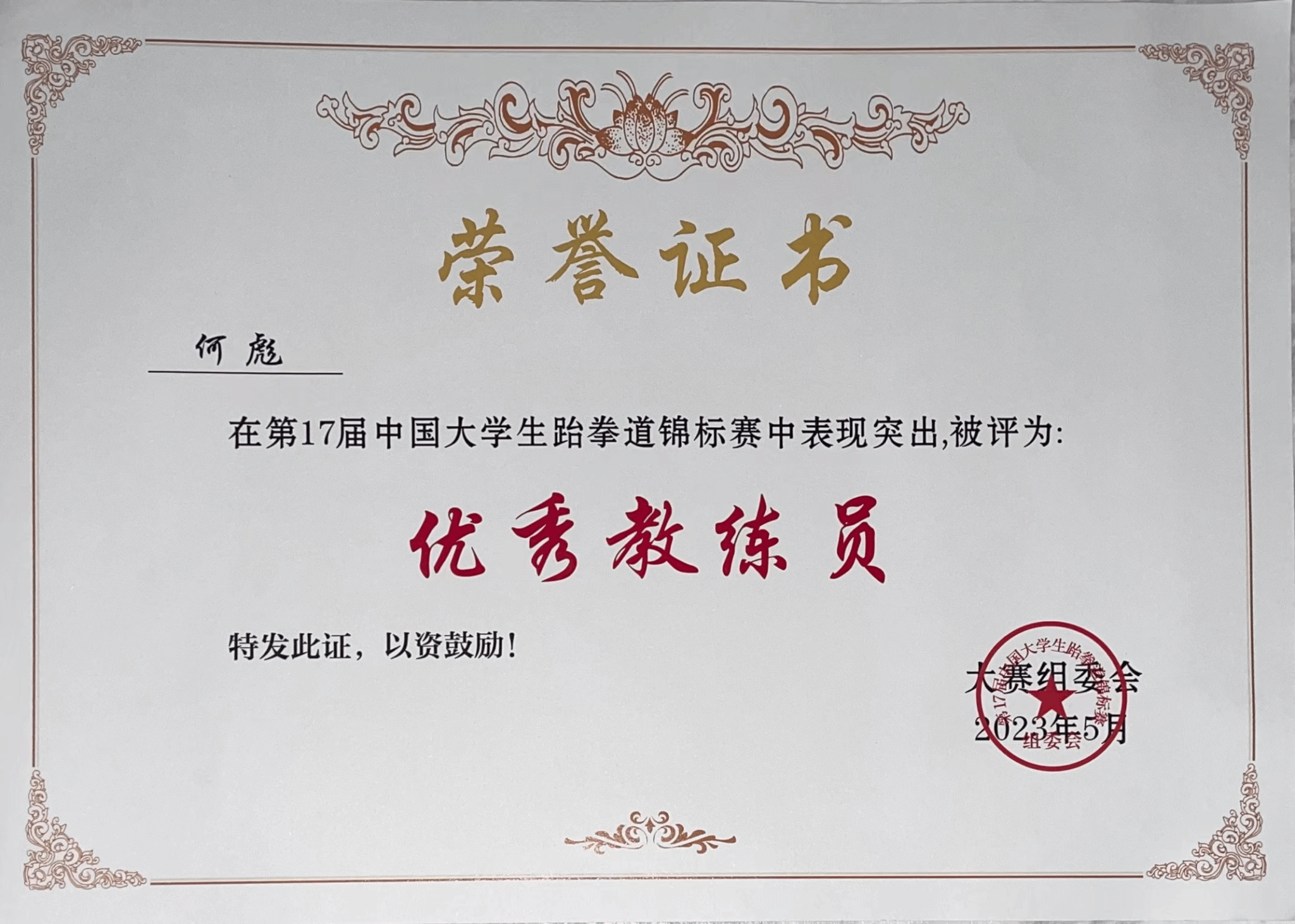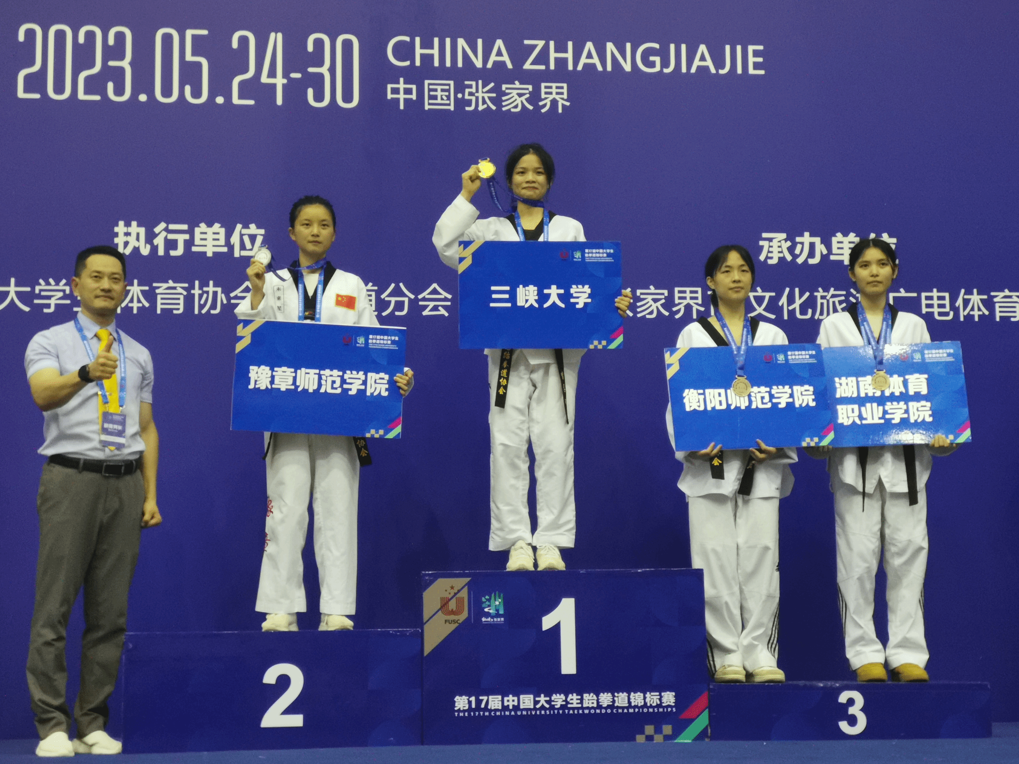 2020级运动训练专业刘磊夺得男子-58公斤级金牌,2022级运动训练专业许奕晨获夺得女子-67公斤级金牌,2020级运动训练专业吴嘉仪获得女子-46公斤级铜牌,2020级运动训练专业张宇获得男子-80公斤级第五名,2020级运动训练专业陈洋豪获得男子-68公斤级第五名,2022级运动训练专业欧阳令知获得女子-53公斤级第五名,2022级体育教育专业刘鑫阳获得男子-54公斤级第五名,2022级体育教育专业吴向宇获得男子-63公斤级第五名。同时,何彪老师被大赛组委会评为中国大学生跆拳道锦标赛“优秀教练员”,刘磊、张宇、吴嘉仪等被评为“优秀运动员”。