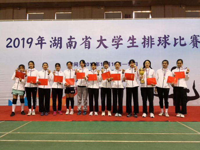 在比赛中队员们顽强拼搏,不急不燥,沉着冷静,激情飞扬。通过一场场的攻坚战,最后以全胜战绩再次卫冕冠军成功。又一次站在2019年湖南省大学生排球比赛学院组的最高领奖台。