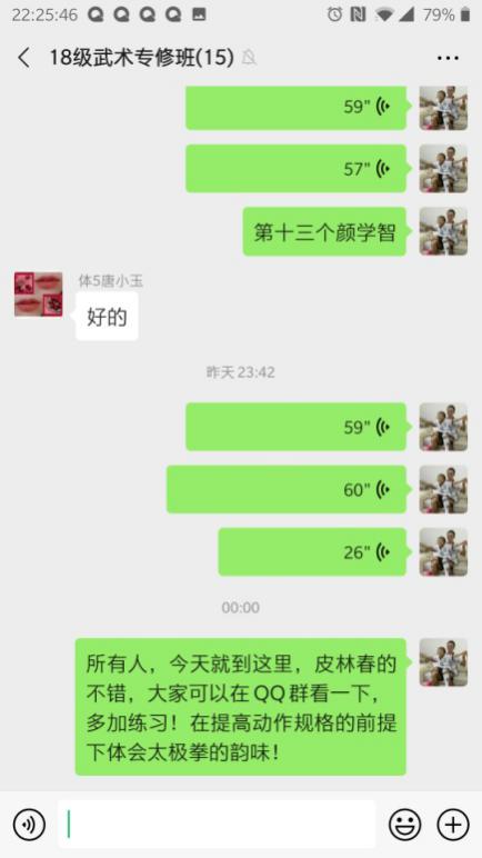 体会:由于课程性质的特殊性,线上教学也遇到了新的问题,学生需要的不是课件,而是动作的准确性及坚持训练的督促问题,因此,李老师采用QQ视频,因为小班教学,QQ视频效果直观,网络不卡,动作示范效果好,其次,为了解决术科坚持训练的问题,上交作业的方式采用视频,也变相督促学生坚持训练,同时录制视频的过程,也激发学生训练的积极性。