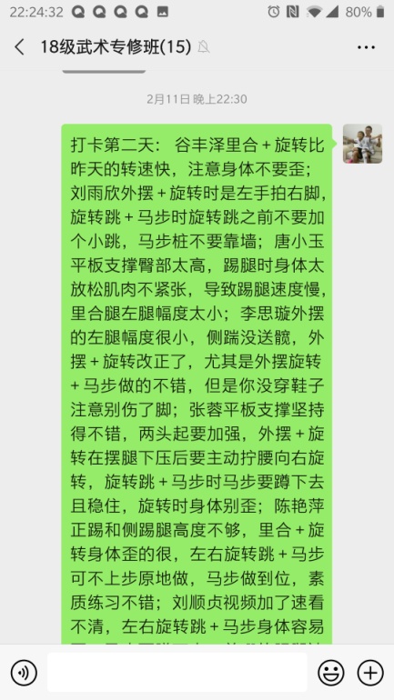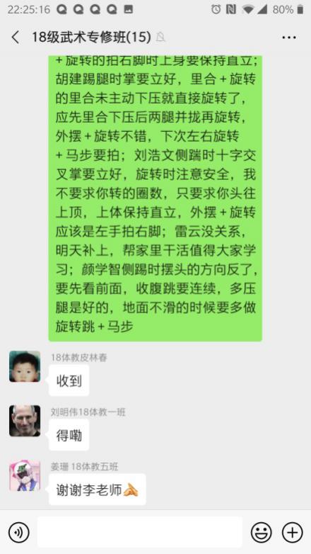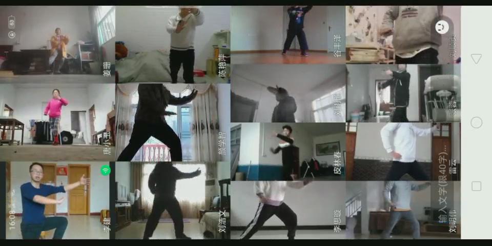 课前通过视频在QQ群里进行学生点名,该课程是专项课程,人数少(14人),不存在缺席旷课现象;课堂中,李老师严格按照疫情期间武术专修教学计划教学,内容包括理论知识、专项技术和素质练习三部分,示范动作标准,虽然无法像平时上课进行手把手纠错,但通过qq视频,依然及时对每位同学的动作进行严格纠错。课后布置课后作业,武术专项需要每天不间断的练习巩固,而且作业也与理论课程不同,李老师采用由每个学生录制个人练习视频发至微信群,第二天在群里逐一点评的方式督促学生每天训练。每周除周六休息一天,其余六天都要求学生进行练习并上传视频至微信群。