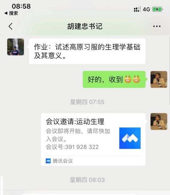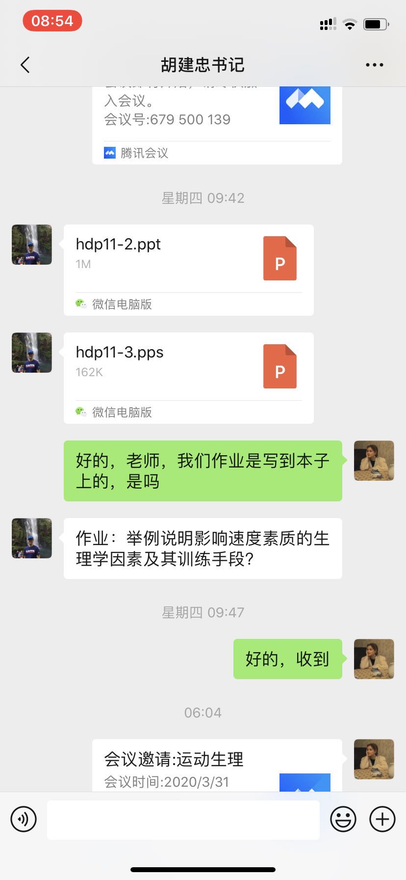 在进行在线教学过程中,胡建忠老师本学期承担365英国上市集团体育教育专业2018级1-6班的《运动生理学》课程,这门课程属于体育教育专业基础课程,又是核心课程,更是教师资格证考试和考研的课程。针对《运动生理学》课程的特点,胡建忠老师采用大学MOOC、腾讯会议APP和微信群的方式进行线上教学。为了保证线上教学万无一失,胡建忠老师在微信建立班级群,平台上传了教学资料。针对不同教学内容的特点,逐一细化,有的内容进行直播,有的内容提前录制好视频,有的内容让学生自学。