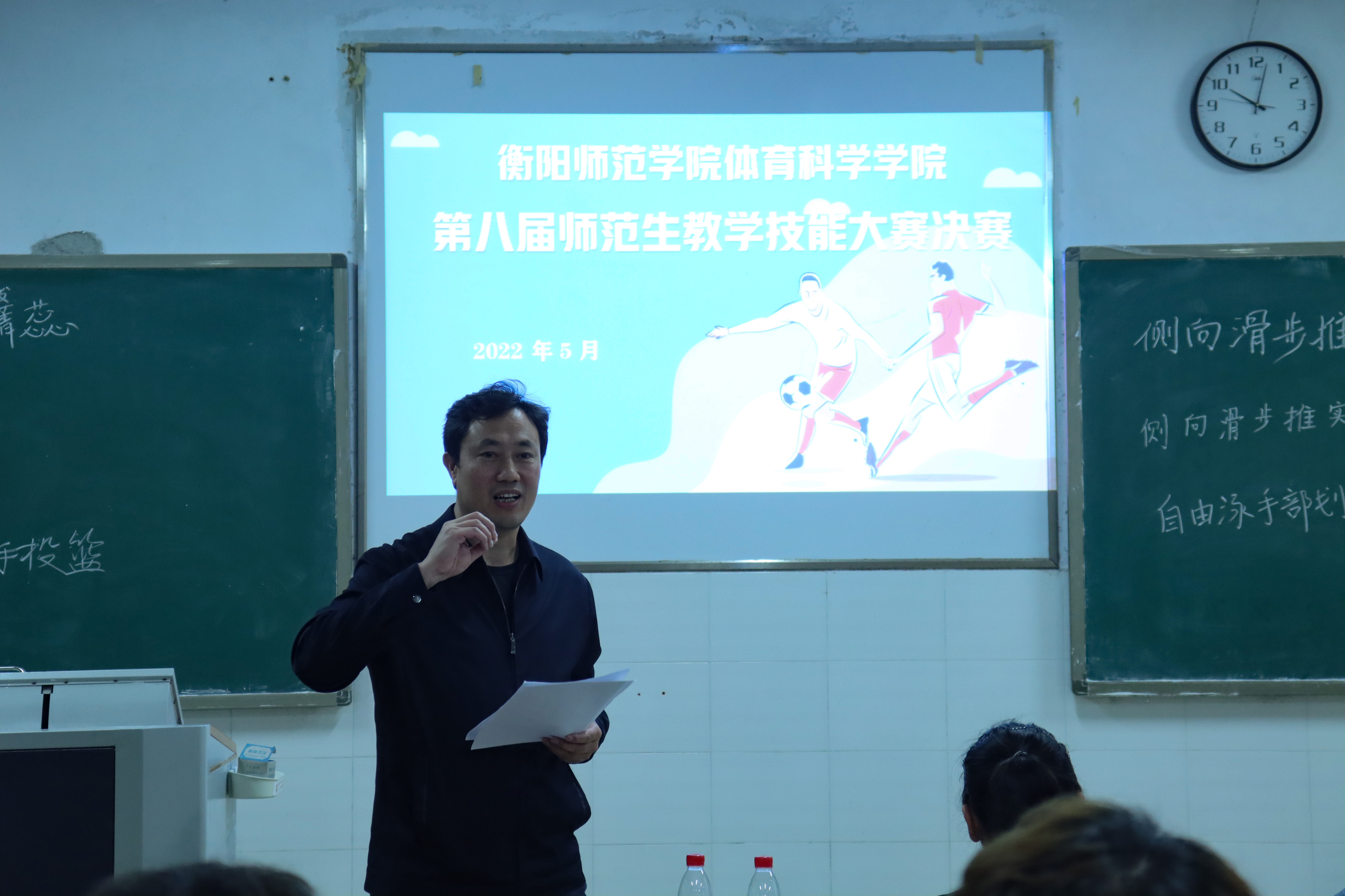 此次大赛由说课、多媒体设计、书写技能、片段教学、教育问答五部分组成。8位来自本部和南岳学院的学生参与决赛,并以抽签的方式决定了本次比赛的出场顺序。参赛选手各有千秋,他们分别选取中学篮球、游泳、田径等项目进行教学,不仅有动作示范,还有体育知识的讲解以及与学生的互动。他们的语言表达准确生动,教学过程设计合理,教学方式新颖,既体现了师范生的基本功,也展现了我院学子的教学能力。选手精彩的表现,赢得了评委的肯定。
