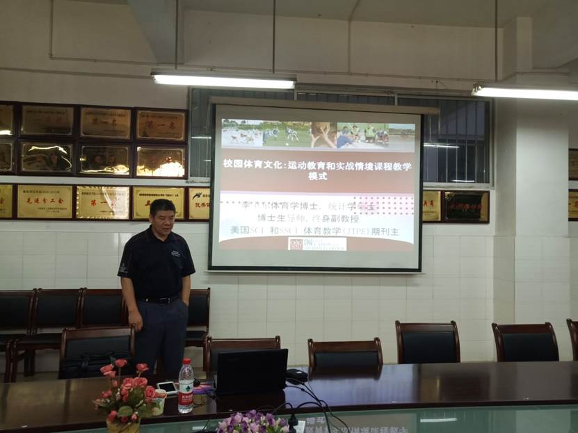2018年7月16日,美国俄亥俄州立大学体育运动与教育学院博士生导师李卫东终生副教授应邀为我院师生做了以“运动教育课程模式和实战情境教学课程模式”为主题的讲座。本次讲座由胡建忠院长主持,我院重点学科骨干老师及2015级卓越足球教师培养实验班全体师生参加。