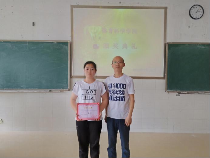 图为体育科学院院师范技能大赛一等奖王晶晶和陈铖副书记合影