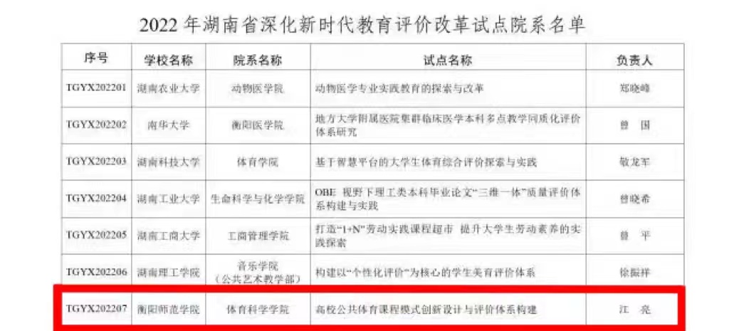 2021年,湖南省出台《湖南省深化新时代教育评价改革实施方案》,2022年省教育厅遴选出湖南省深化新时代教育评价改革试点院(系)30个,365英国上市集团成为试点之一,对“高校公共体育课程模式创新设计与评价体系构建”展开探索实践。会上,江亮院长从我校公共体育课程目标、预期成效、课程模式、课程实施、改革步骤及运行关键等方面作了报告,要求相关负责人和教师从2023年春季学期开始着手公共体育课程评价改革的相关工作推进。江院长指出,此次改革将构建以学生为主体的新型体育教学模式,对学生进行多角度、多形式的评价,充分调动学生学习的兴趣,培养学生多种能力,促进学生全面发展。同时,江院长要求参与试点的教师们将任务细化,同心协力,积极探索,做好课程评价改革各项工作。最后,相关参会人员就江亮院长的报告进行了深入地探讨,并提出了各自的改革意见和建议。